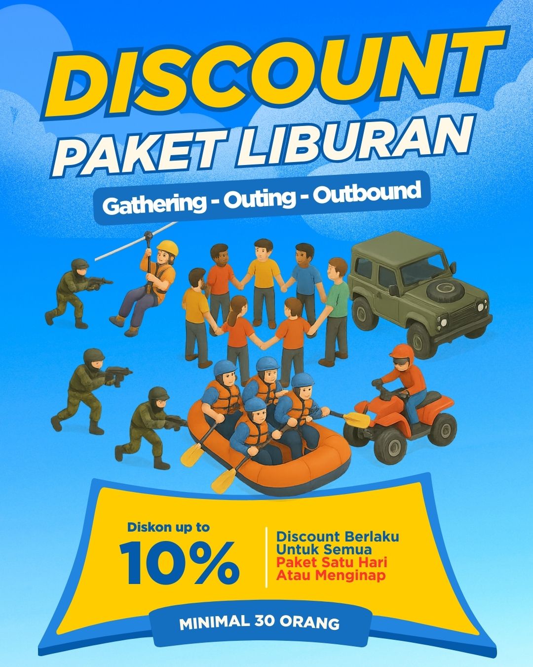 Di rancang khusus untuk acara perusahaan atau komunitas, paket ini memastikan setiap anggota tim dapat merasakan kebersamaan melalui aktivitas yang memacu semangat. Harga mulai dari Rp550.000 per orang.